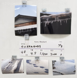 木造の真壁づくりというのかな、町屋というか、金沢特有の歴史的建造物のような家屋ですね。瓦から伝わった熱で溶けた雪が水になってから再び凍る。ちょっと前まで、私は雪だったんだよと言わんばかりに姿を変え、今もなお水滴が落ちていると。気温によっては、更なる成長を遂げて長さを更新するのか、はたまた丸ごと溶かされて下へ落ちるのか。そういった、儚さを持っているツララですね。雪がなければ、タイヤ跡、足跡は残りません。北陸の冬の日常をうまくとらえてきているなと思います。最後の写真は、降り積もった雪がじわじわと溶かされて、不思議な形になっている雪模様のように見えます。雪には色々な質感があります。面白いですね!